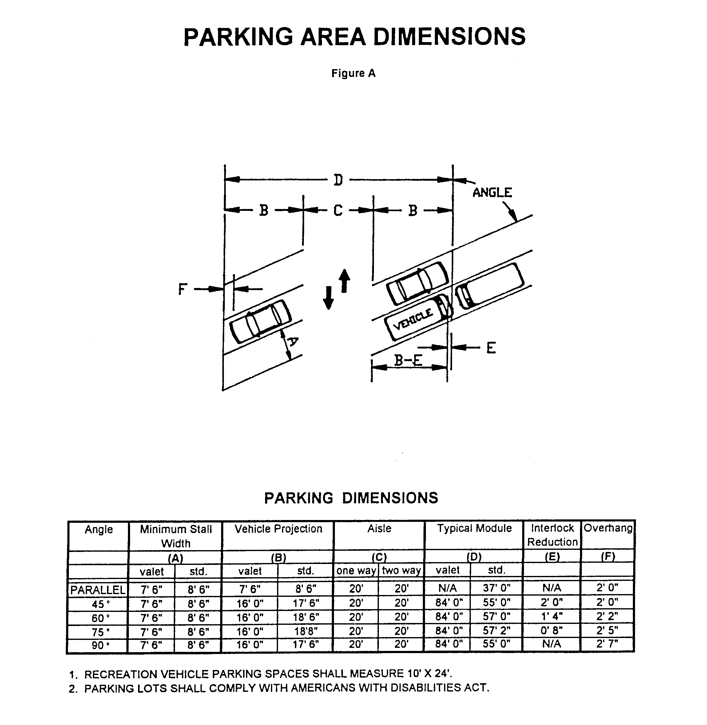 Parking area design standards. All parking areas, driveways and maneuvering areas shall be constructed to the dimensional standards shown in Figure A. The standard parking space shall measure eight (8) feet six (6) inches by eighteen (18) feet. All parallel parking spaces shall measure eight (8) feet six (6) inches by twenty-two (22) feet. Recreational vehicle parking spaces shall measure ten (10) feet by twenty-four (24) feet.