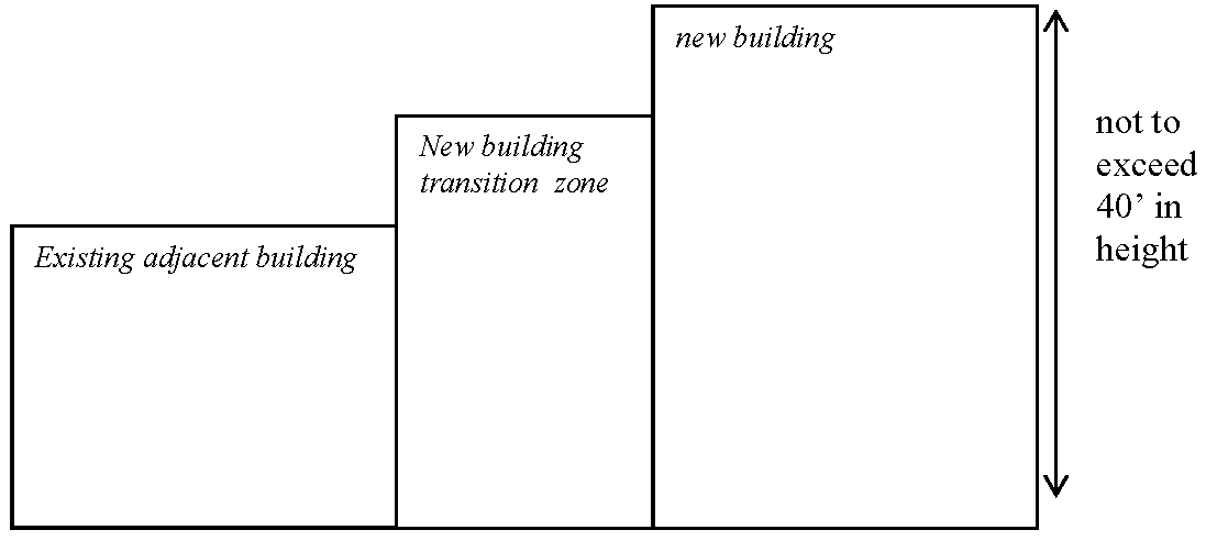 The building mass from street to highest point of building shall be broken up to provide a transition from the height and scale of existing adjacent buildings, or from the nearest, existing building considered to be a contributing property of the historic district.