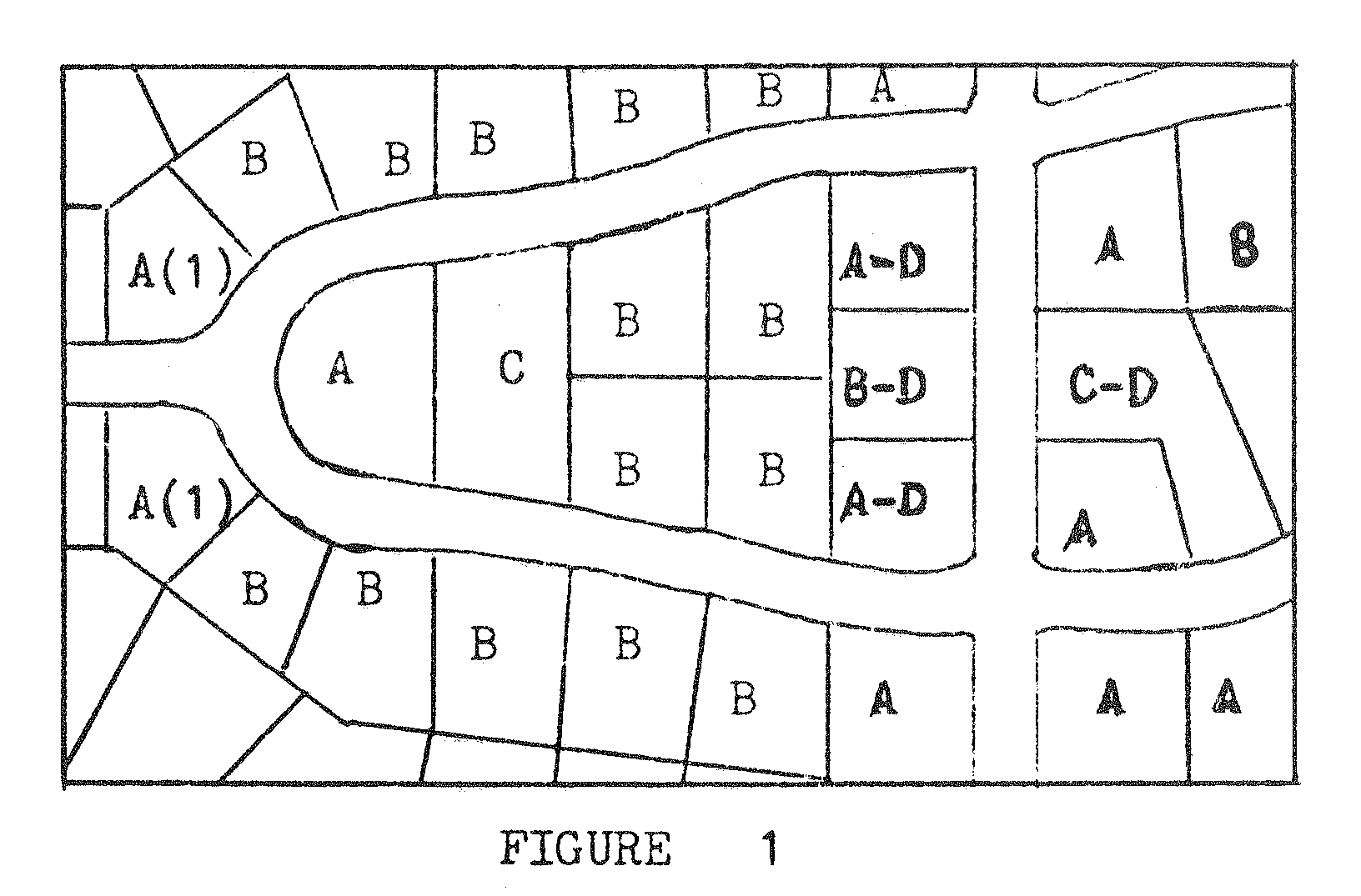 D-reversed frontage lot, defined as a lot on which the frontage is at right angles or approximately right angles (interior angle less than one hundred thirty-five (135) degrees) to the general pattern in the area. A reversed frontage lot may also be a corner lot (A-D in the diagram), an interior lot (B-D) or a through lot (C-D).