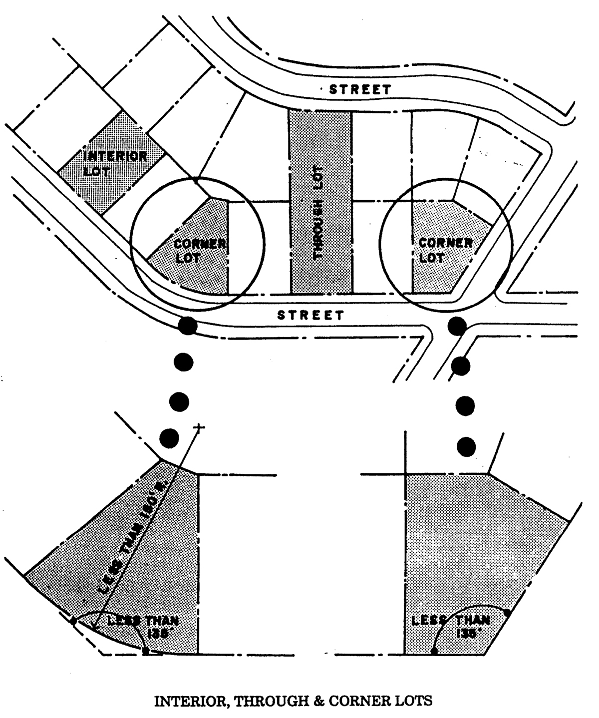 Lot, corner shall mean a lot where the interior angle of two (2) adjacent sides at the intersection of two (2) streets is less than one hundred thirty-five (135) degrees. A lot abutting upon a curved street or streets shall be considered a corner lot for the purposes of this chapter if the arc is of less radius than one hundred fifty (150) feet and the tangents to the curve, at the two (2) points where the lot lines meet the curve or the straight street line extended, form an interior angle of less than one hundred thirty-five (135) degrees.