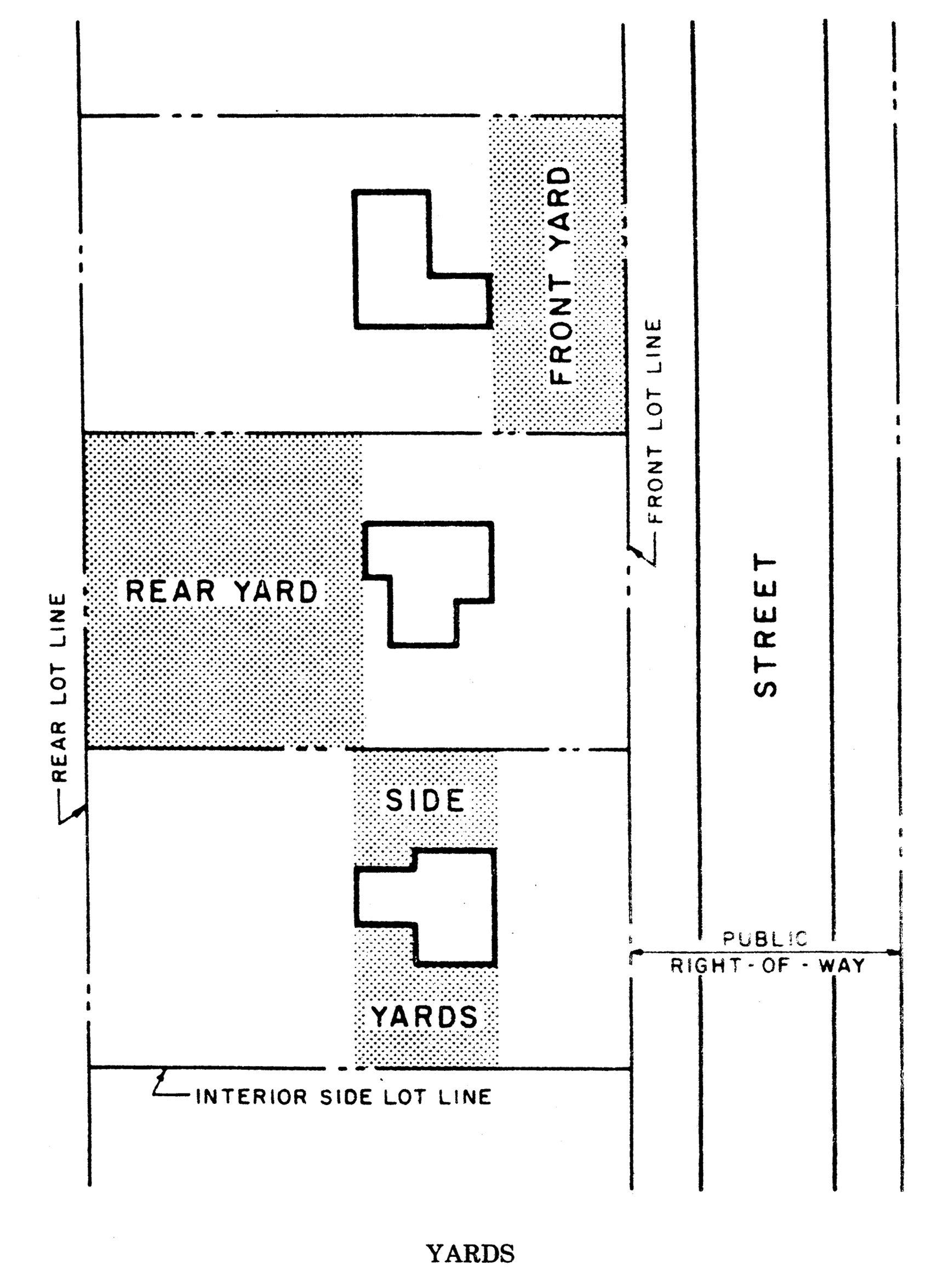 Yards shall mean the open spaces on the same lot with a main building unoccupied and unobstructed from the ground upward except as otherwise provided in this chapter, and as defined below: