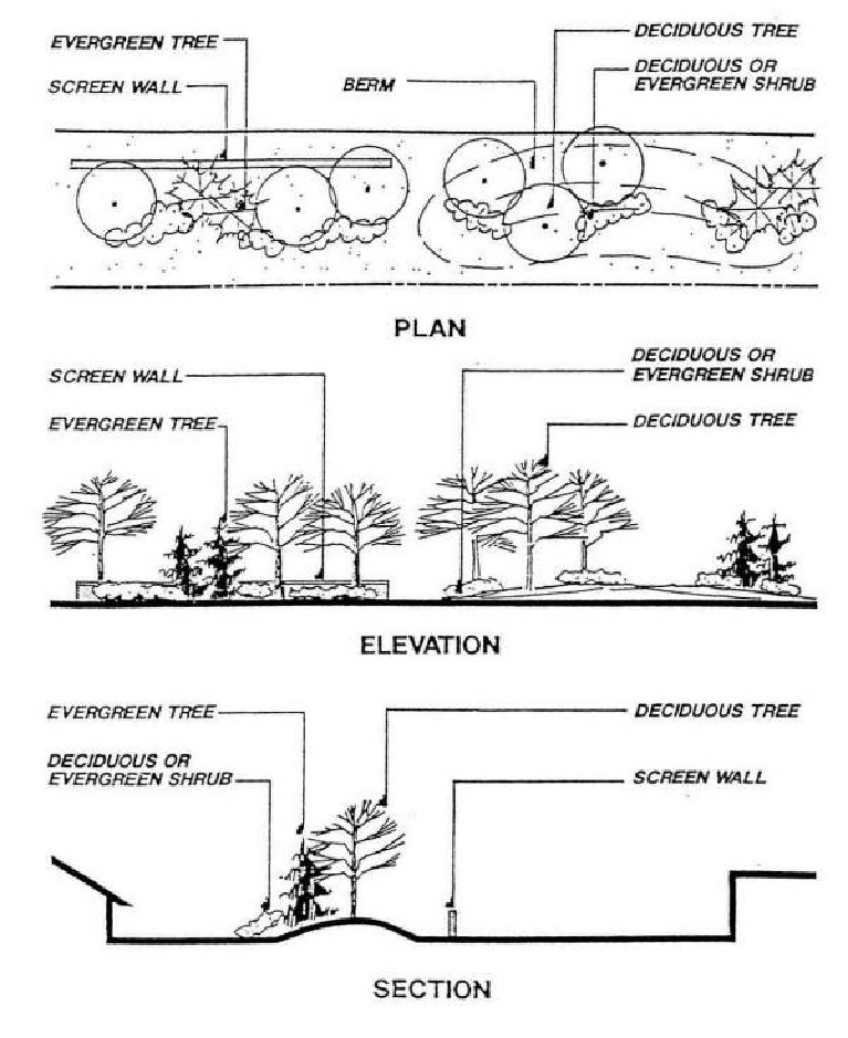 If not located within a building, units shall be screened by densely planted landscaping or a solid screen or masonry wall at least one (1) foot higher than any part of the unit, located to screen the view from abutting property or a public street. The solid screen or masonry wall shall contain the use of materials identical to those used in the main building at the point of placement of the unit. Plantings shall be spaced so as to provide an immediate screening effect. Evergreen plant material utilized in screening shall be maintained in a healthy condition. Dead or diseased plant materials shall be replaced with healthy materials of like size and kind.
