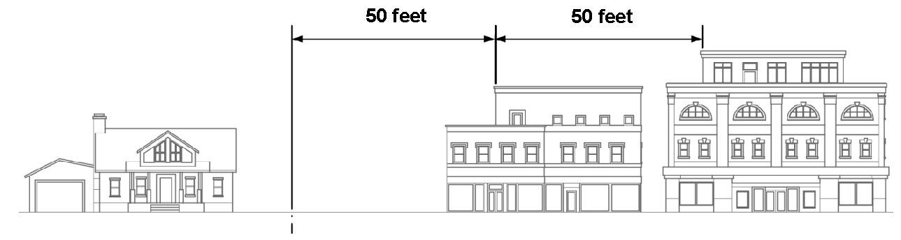 [1] When adjacent to the R1, R2, R3, or R4 zoning district, the minimum setback shall be increased by one foot for each foot of building height over thirty feet.