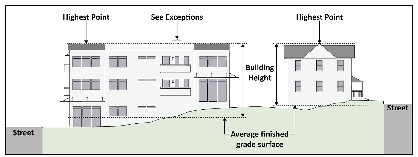 Overall Dimension. The height of buildings shall be measured as the vertical distance from the average finished grade surface of the building, structure, or wall exposed above the ground surface to the highest point of the roof, parapet wall, or uppermost part.
