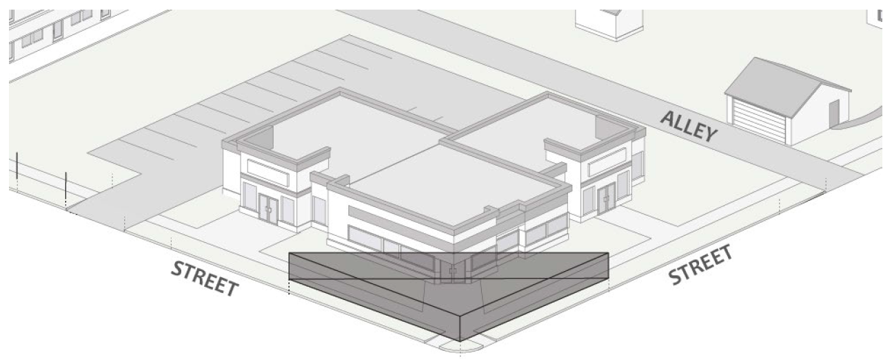 The minimum front building facade at the build-to range percentage shall be determined by calculating the width of the principal building that is within the build-to range divided by the total width of the lot at the street frontage.