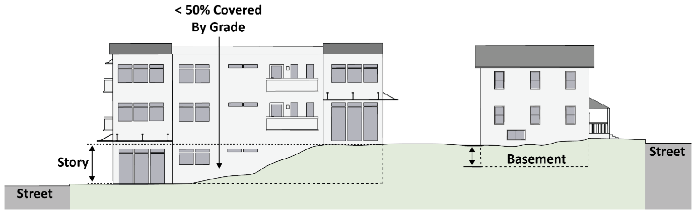 "Basement (generally)" means in all other contexts, that portion of a building that is partly or wholly below grade, as measured four feet from the exterior of the foundation wall, regardless of whether the interior space is finished or unfinished. A basement shall be counted as a story for determining building setbacks and number of stories if the front exterior wall of the basement facing a street is not completely below grade and each side of the foundation wall facing the side yard is less than fifty percent covered by grade.