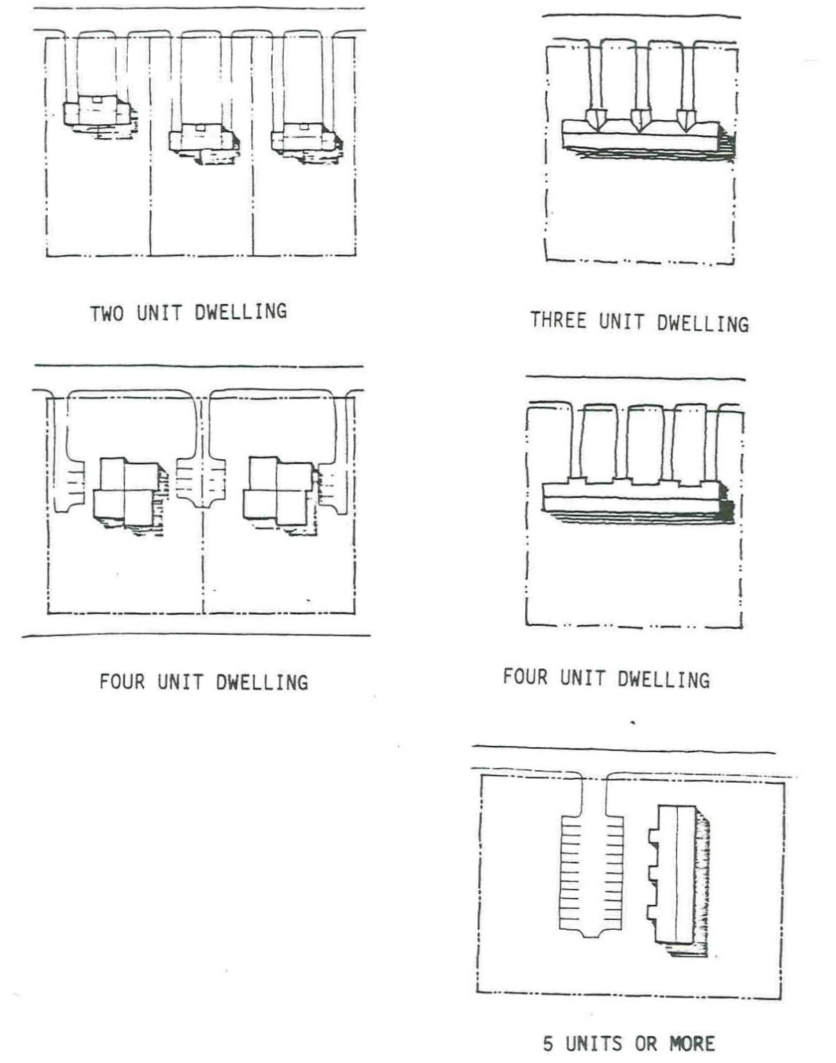 Dwelling structures which are front face to front face or back face to back face or front face to back face shall be not less than 60 feet apart. Dwelling structures which are side face to side face shall be not less than 20 feet apart. Dwelling structures which are side face to front face or back face shall be not less than 40 feet apart.