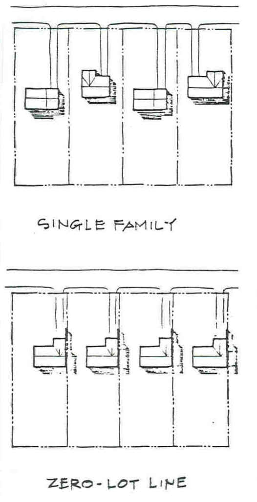 Dwelling, zero-lot-line, means a development of single-family detached residence in which one interior side yard may be lawfully reduced to zero on any lot for the purpose of creating larger, more usable, and more easily maintained yard spaces, particularly on smaller lots. See Figure 4: Single-Family Detached Dwellings.