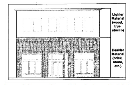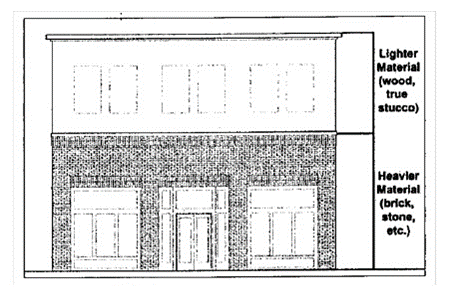 Facade material changes. As illustrated below, facade materials shall change vertically, not horizontally.