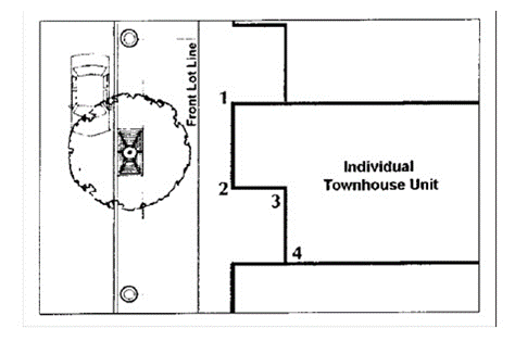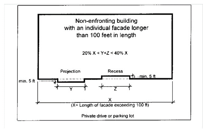 Principal building facades. Principal building facades of individual units shall have no more than four corners, excluding bay windows, stoops, or porches, as illustrated below.