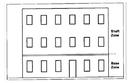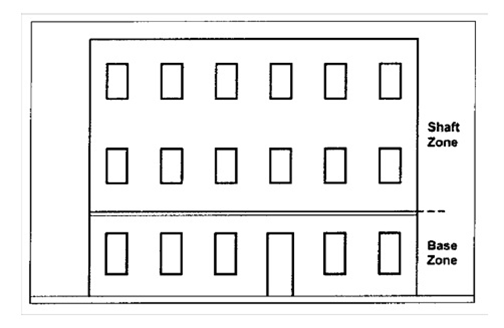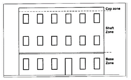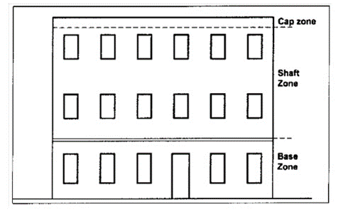 Two-part or three-part facades. Buildings taller than two floors shall have two-part or three-part facades. Horizontal zones in the facade may be differentiated by a change in materials, window pattern, or window material, or by a cornice or course.