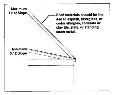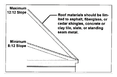 Sloped roofs. Principal sloped roofs shall have a pitch of between 8:12 and 12:12 and their eaves shall overhang between 12 and 36 inches beyond the facade, as illustrated below. This does not apply to dormers, porches, and roofs not visible from a street.