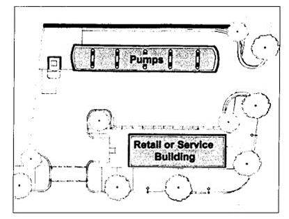 Accessory structures. Accessory structures such as canopies, and automobile wash or detailing shall match the architectural style and material of the principal structure, and shall be located further from the street frontages than the principal building, as illustrated below.
