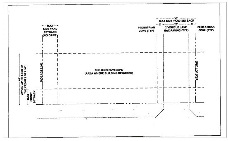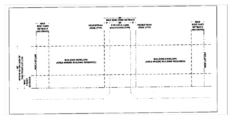 Building side setbacks and driveway widths. As illustrated below, the maximum side setbacks for frontage buildings shall be ten feet, for a depth of the first 40 feet back from the future or current right-of-way, whichever is wider. However, a maximum side setback of 30 feet is allowed to accommodate a two-way driveway and pedestrian walkways. For a centrally located driveway between multiple frontage buildings on the same property, a maximum separation of 30 feet is allowed to accommodate a two-way driveway and pedestrian walkways.
