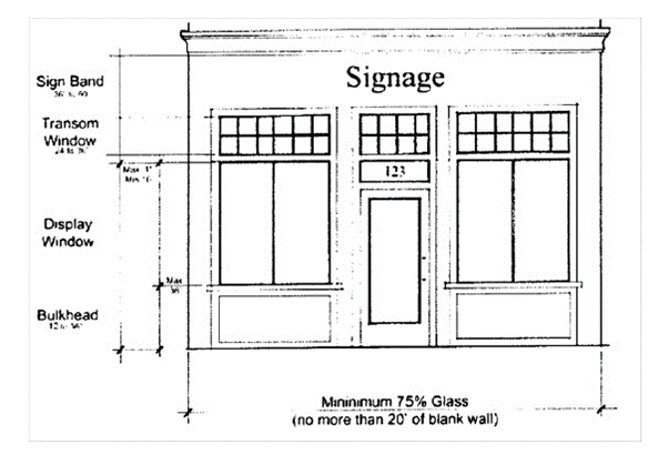 A glass transom not less than 24 inches and not more than 36 inches tall, located above the glass display window(s) and entrance door(s);