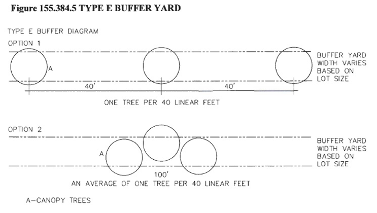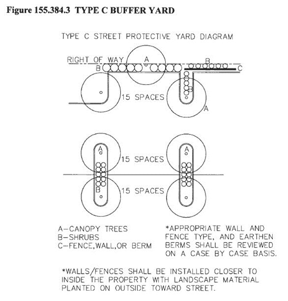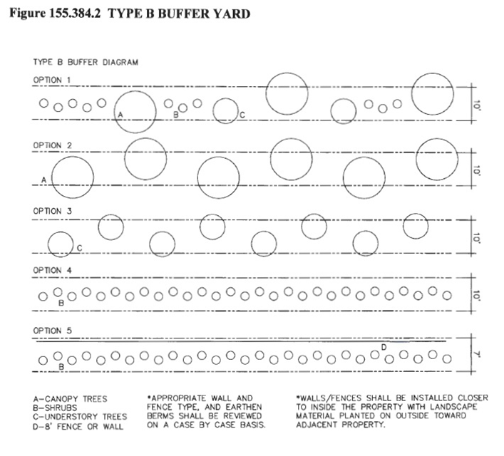 Composition of the Type B landscaping may include a wall, fence, earthen berm, planted vegetation, existing vegetation or any appropriate combination of these elements. Provided that walls or fences or berms are used, shrubs shall be required. (See Figure 155.384.2: Type B Buffer Yard.)