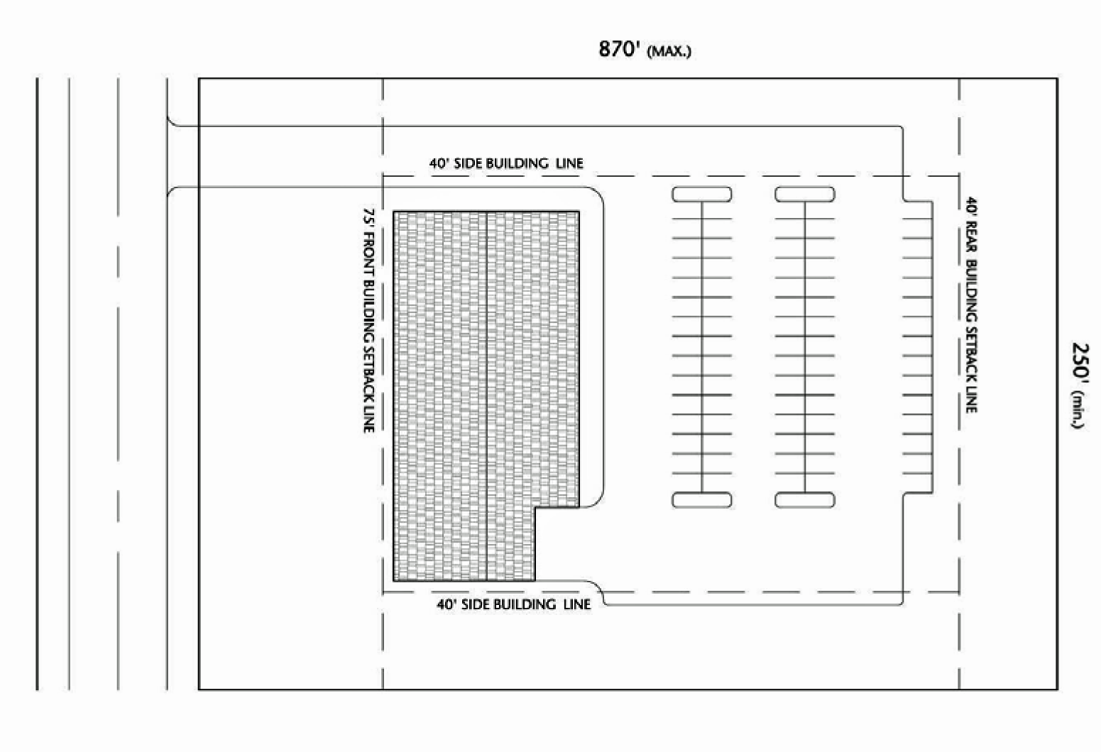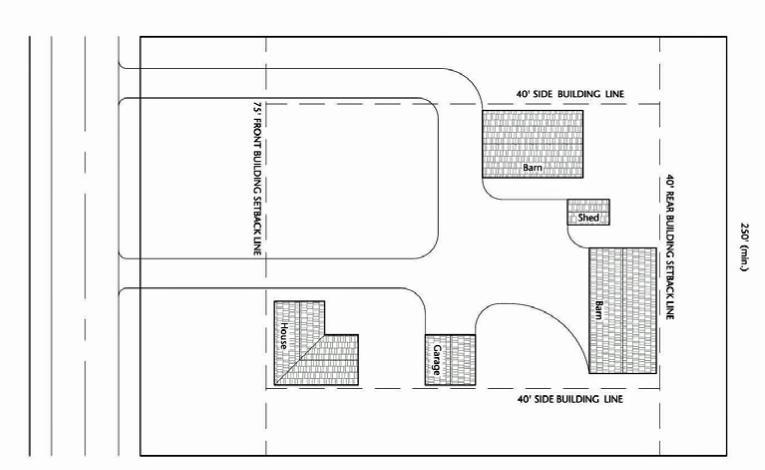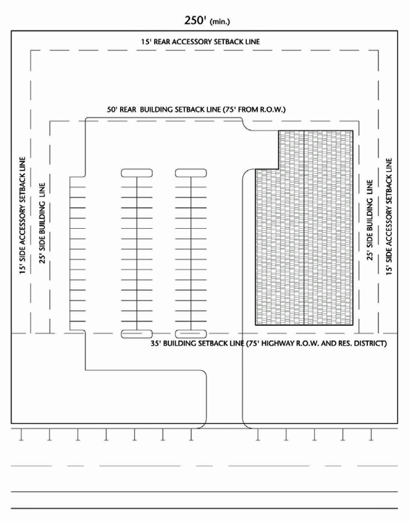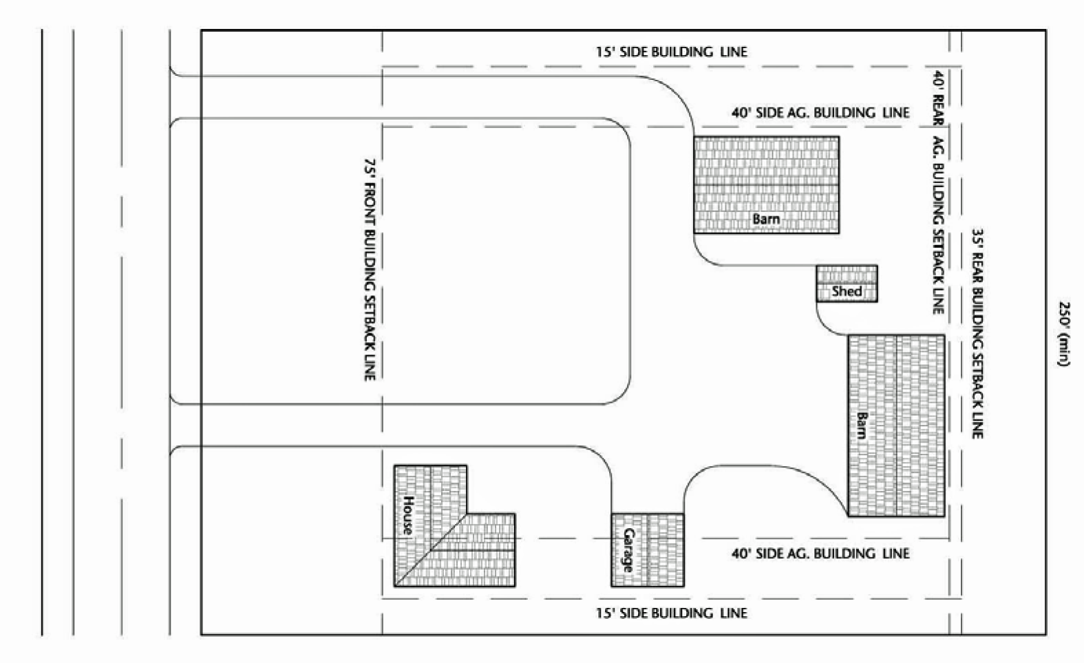 • Have a lot width of at least 250 feet measured at the building line.