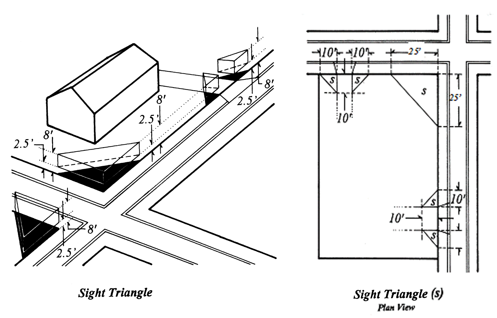 Fences, including walls, and planting material used in the nature of a fence, placed or maintained on any portion of any public right-of-way or in any required yard which, by the nature of the materials used for its construction, its design or location would impair public safety by interfering and obstructing the vision of persons using the streets, sidewalks or driveways on or adjacent to such a yard. No such fence may be located within the sight triangle, the sides of which are formed by the right-of-way lines of two intersecting streets, or a street and a driveway, or a street and an alley. The length of the sides of said triangle shall be 25 feet along the street right-of-way that intersect, and ten feet along the right-of-way and the driveway or an alley when a street intersects with an alley or a driveway.