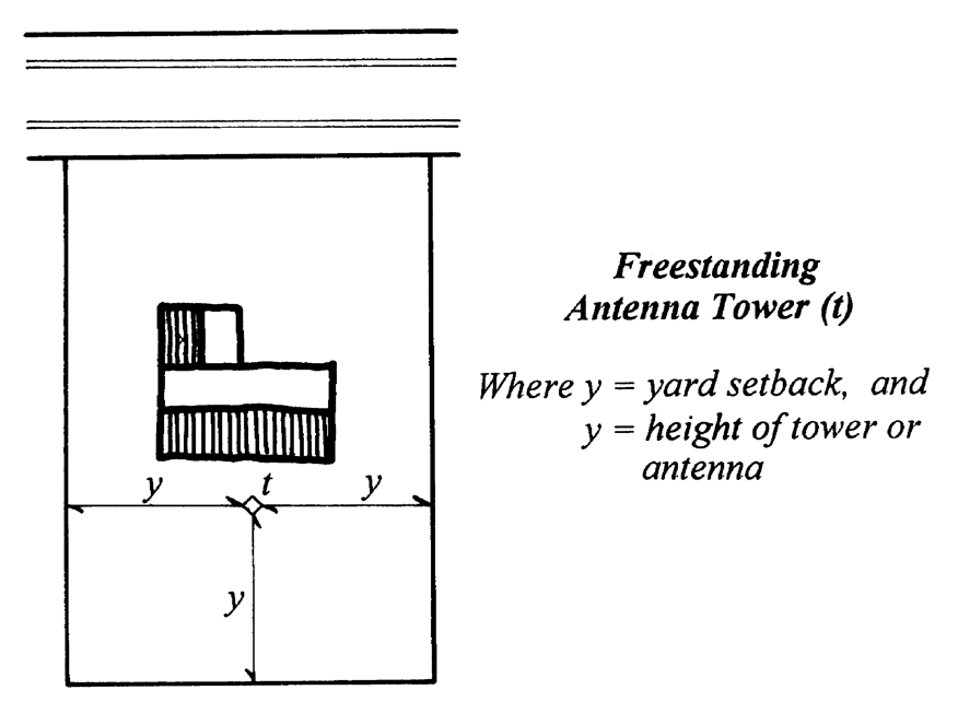 Freestanding towers or antenna structures and satellite dishes that are unattached to the principal structure shall not be located closer to the lot line than the total height of the tower, satellite stations or antenna structure. All unattached, freestanding towers, satellite dishes or antenna structures shall be located in the rear yard and must be properly guyed entirely within the limits of the property.