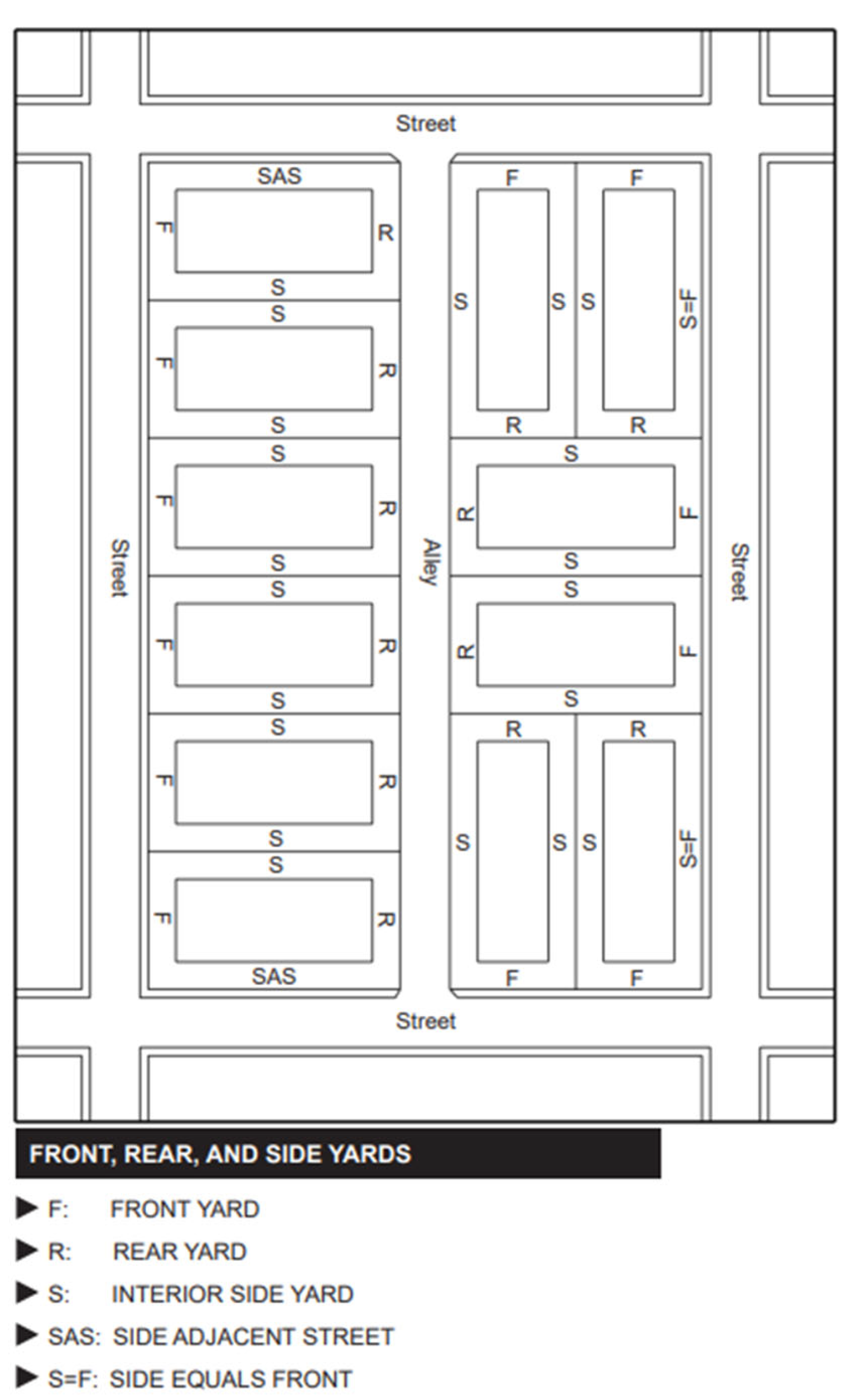 Yard, front, rear, and side means the open space between the buildings and the property lines at the front, rear, and sides of the property, respectively and consistent with Figures 16-4 and 16-5 of this section. On a corner lot, the open space adjacent to the shorter street right-of-way shall be considered the front yard. The rear yard is opposite the front yard, and the side yard is between the rear yard and the front yard.