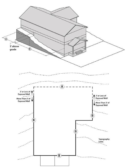 Wall area A is partially exposed above grade by three feet or less. Wall area B is exposed above grade by more than three feet. For example: