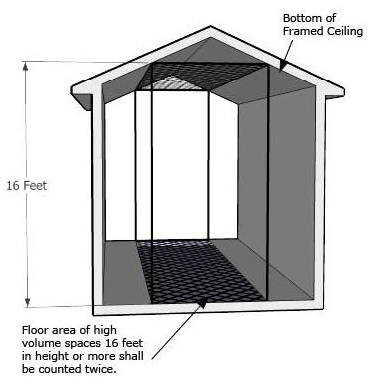 The floor area of a high volume space where the distance between any floor and the bottom of the framed ceiling directly above it is sixteen feet or more shall be counted twice. If the distance between any floor and the bottom of the framed ceiling above it is twenty-six feet or more, the floor area shall be counted three times. Up to 150 square feet of a stairwell shall not be considered a high volume space subject to the requirements of this paragraph.
