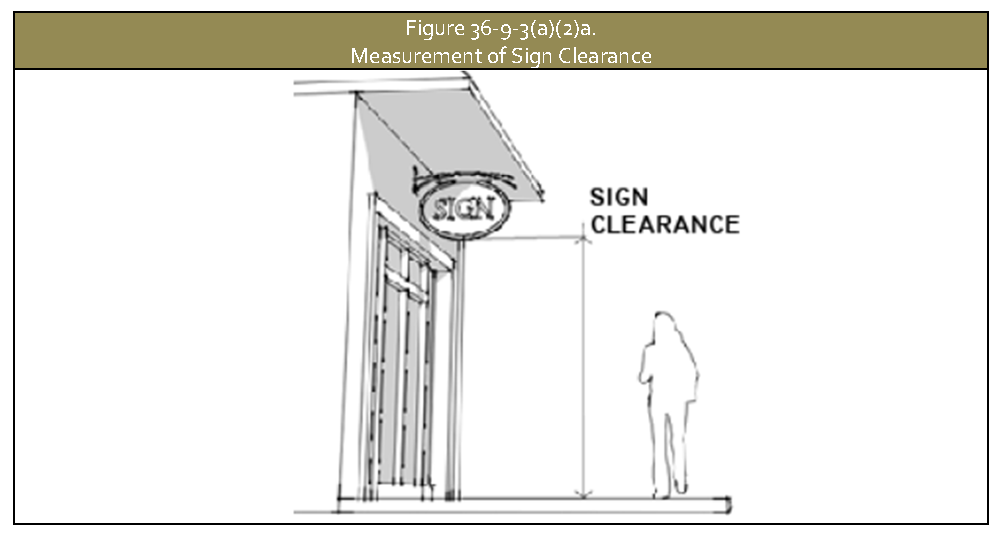 Sign clearance. Sign clearance is the distance between the bottom of a sign face or structural element that is not affixed to the ground and the nearest point on the surface under it. See Figure 36-9-3(a)(2)a., Measurement of Sign Clearance.