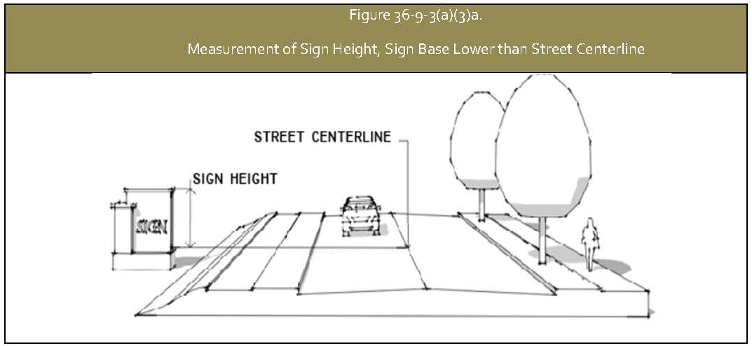 Where the natural grade of the ground where the sign is to be located is lower than the street centerline, the vertical distance to the top of the sign face or sign structure, whichever is higher, measured from the elevation of the centerline of the adjacent street. See Figure 36-9-3(a)(3)a., Measurement of Sign Height, Sign Base Lower than Street Centerline.