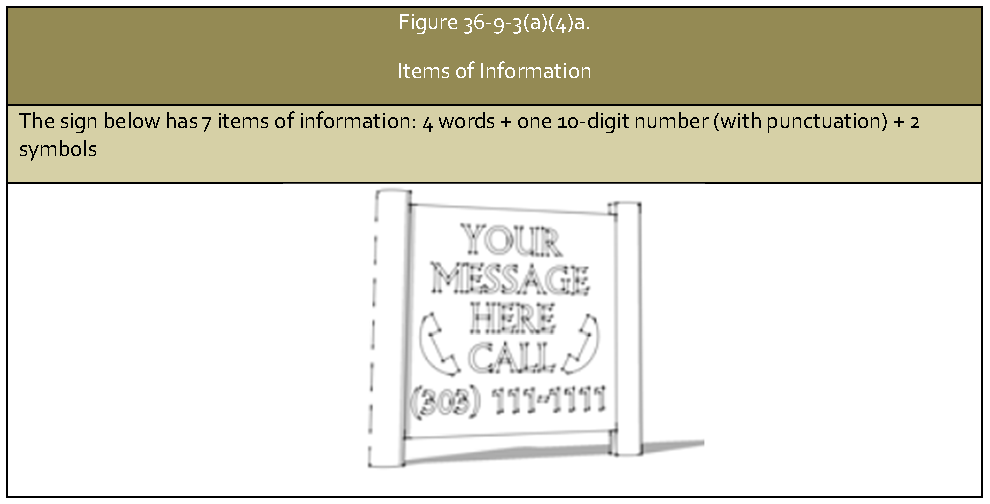 Items of information. An item of information is a word, logo, abbreviation, symbol, geometric shape, image, or number with 10 or fewer digits (punctuation of numbers does not increase the number of items of information). See figure 36-9-3(a)(4)a., Items of Information.