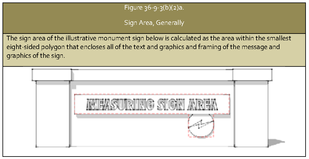 Generally. Sign area is calculated as the area within a continuous perimeter with up to eight straight sides that encloses the limits of text and graphics of a sign, together with any frame or other material or color forming an integral part of the display or used to differentiate the sign's message from the background against which it is placed. The area excludes the structure upon which the sign is placed (unless the structure is an integral part of the display or used to differentiate it), but includes any open space contained within the outer limits of the display face of a sign, or between any component, panel, strip, or figure of any kind composing the display face, whether this open space is enclosed by a frame or border or not. See Figure 36-9-3(b)(2)a., Sign Area, Generally.