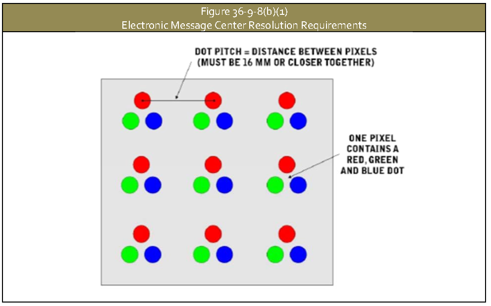 All electronic message center display components shall be full color with a minimum pitch resolution of 16 mm spacing or better (i.e. 10 mm, 12 mm, etc.)
