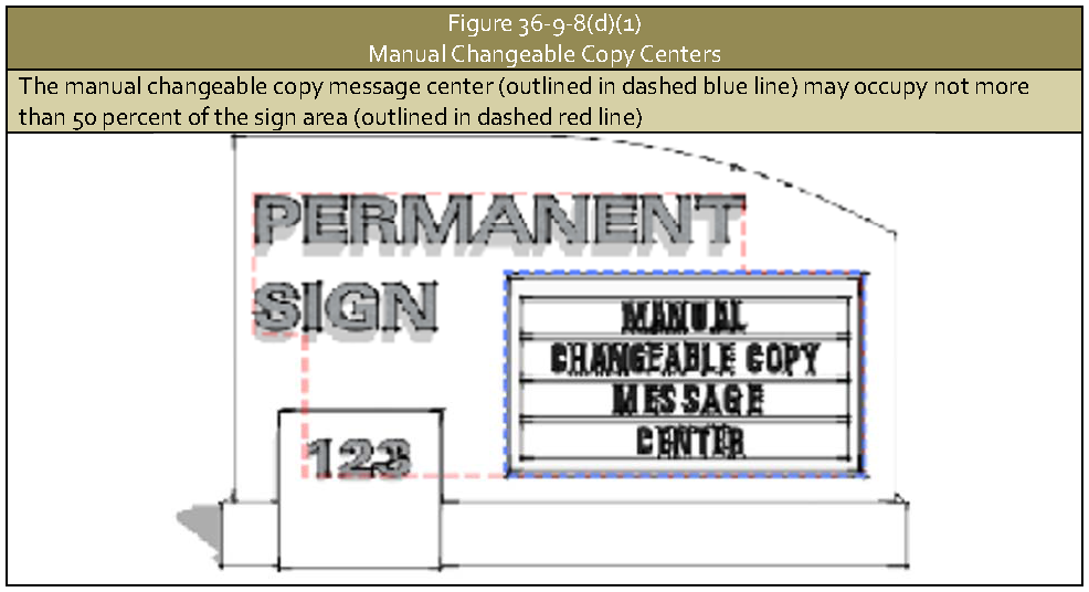 Manual changeable copy message centers, including their frames, shall make up not more than 50 percent of the sign area. The balance of the sign area shall utilize permanently affixed letters or symbols. See Figure 36-9-8(d)(1) Manual Changeable Copy Centers.