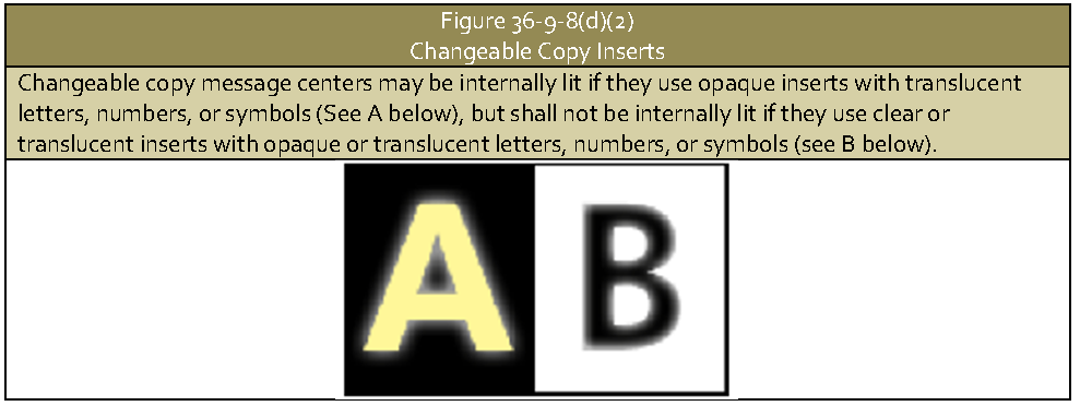 They use opaque inserts with translucent letters, numbers, or symbols (see Figure 36-9-8(d)(2), Changeable Copy Inserts);