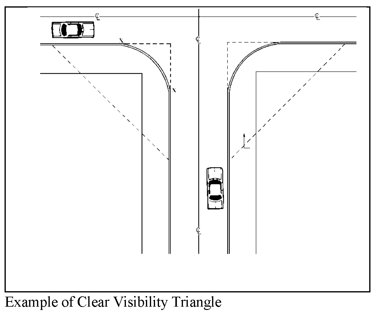 Clear visibility triangle. In order to provide a clear view of intersecting streets to the motorist, there shall be a triangular area of clear visibility formed by two (2) intersecting streets or the intersection of a driveway and a street. The following standards shall be met:
