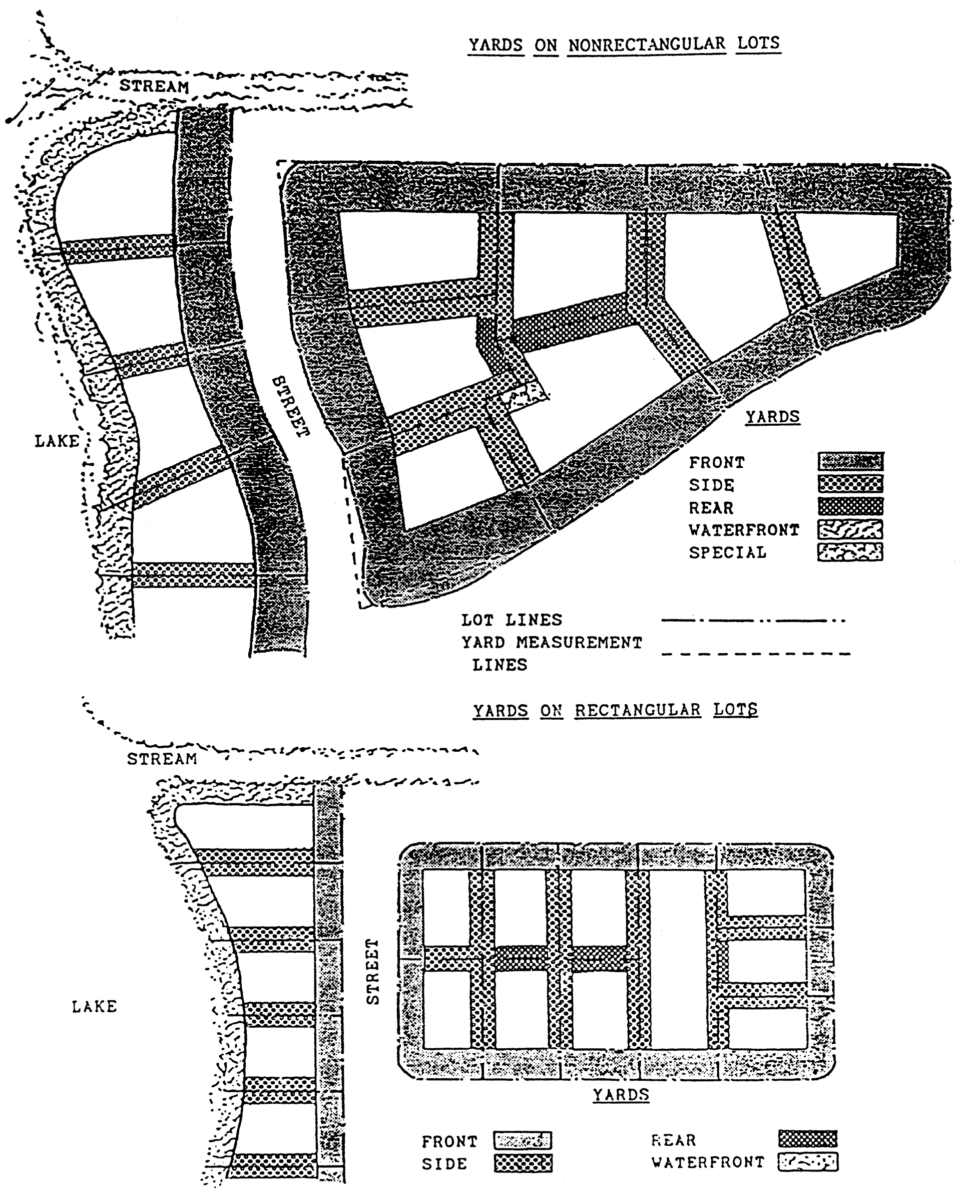 For explanation of how to measure the various types of yards, on rectangular and nonrectangular lots, as defined in the following definitions, see accompanying diagrams [following this section].