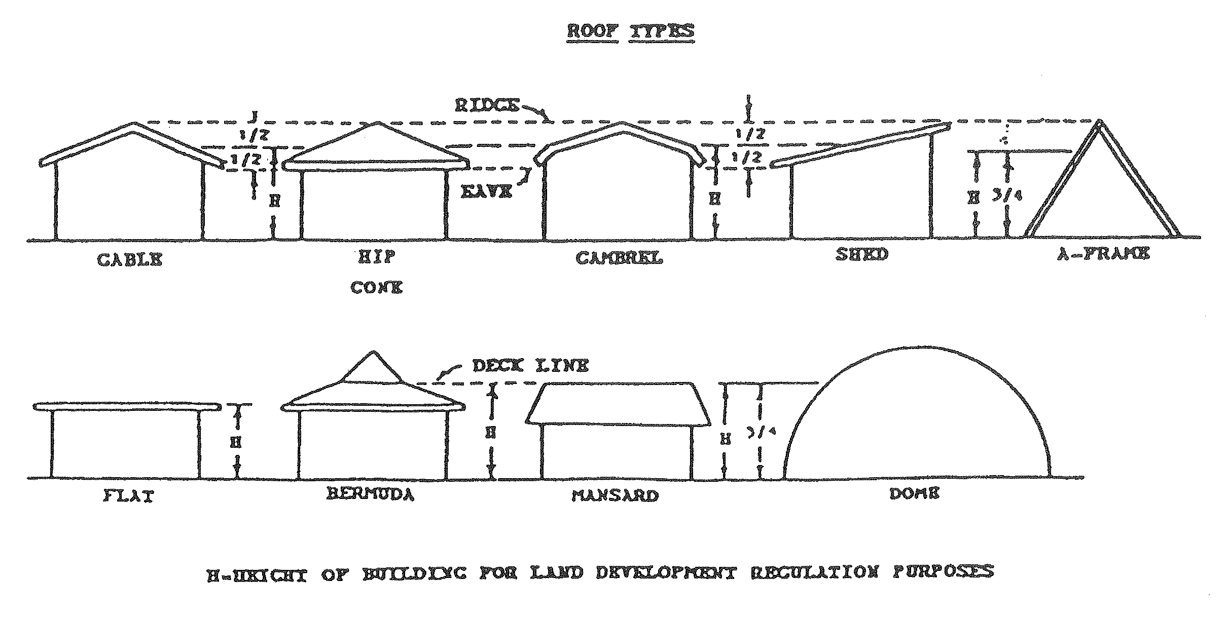 Building, height of. Height of building means the vertical distance measured from the established grade at the corner of a front of a building to the highest point of the roof surface of a flat roof, to the deck line of a mansard roof or Bermuda roof, to the mean height level between eaves and ridge of gable, hip, cone, gambrel, and shed roofs, and to a height three-fourths the distance from the ground to the apex of A-frame and dome roofs, as depicted in the diagram below (See article 4, [section 4.2.10,] Exclusions from height limitations).