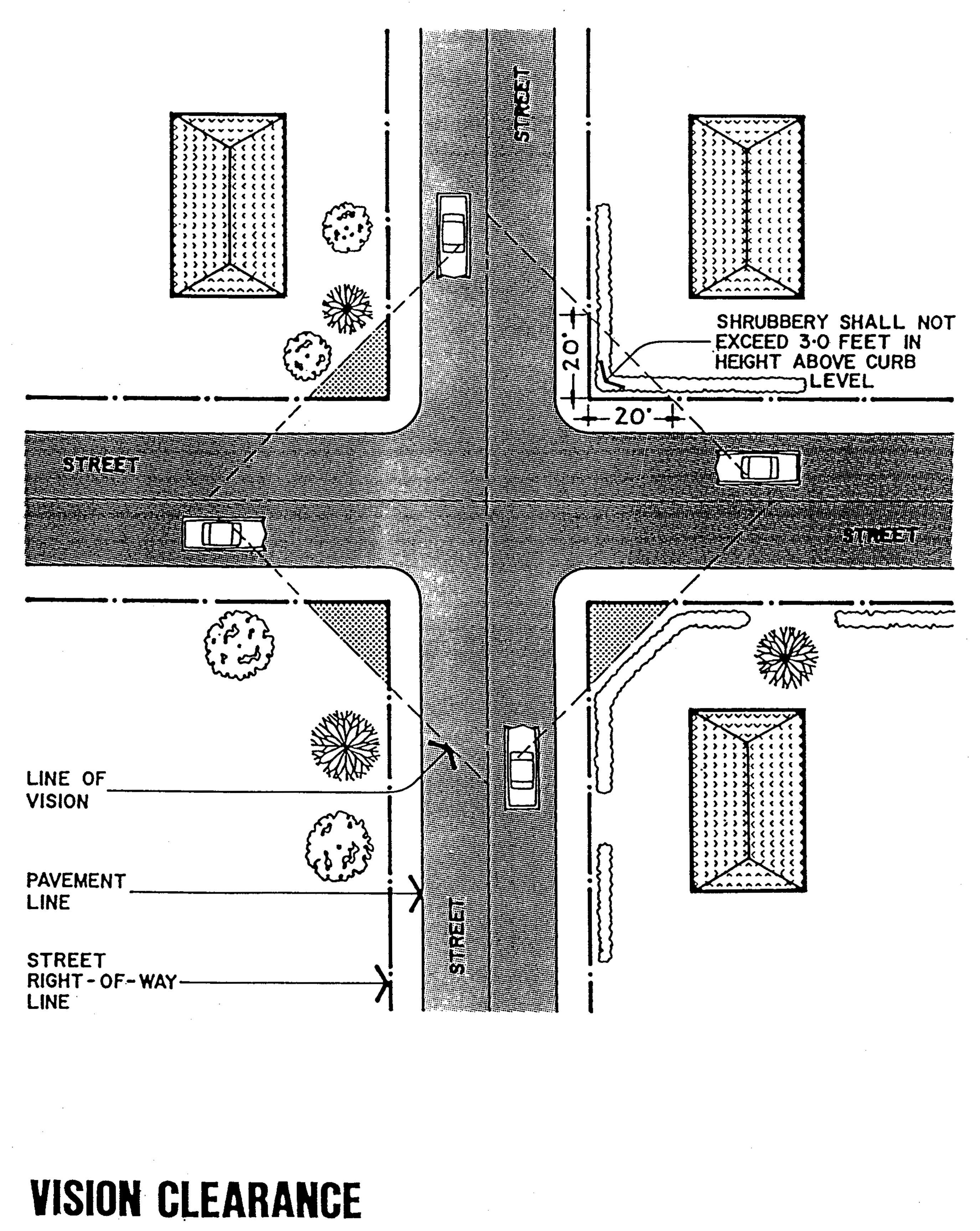 Vision clearance; corner lots. (See Illustrations.) All corner lots shall provide for a clear sight distance (traffic view obstruction triangle), not less than three feet in height above the elevation at the centerline of the traveled way, free from all buildings, structures, plant materials, play equipment, or parking, loading or storage uses in accordance with the following specifications: