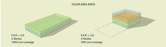 • Floor area ratio. The ratio of the total building floor area in square feet to the total land area in square feet, based upon a 1:0 ratio, constituting a one-story building or structure occupying 100 percent of the underlying land.
