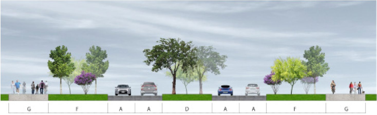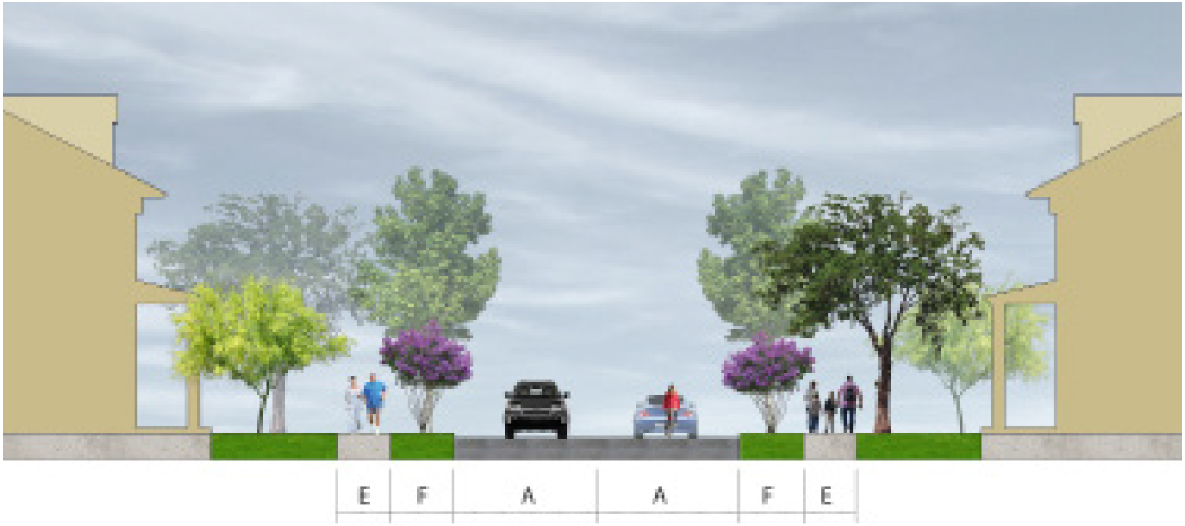 | Streetscape | Appropriate street trees in median and tree lawn/verge |