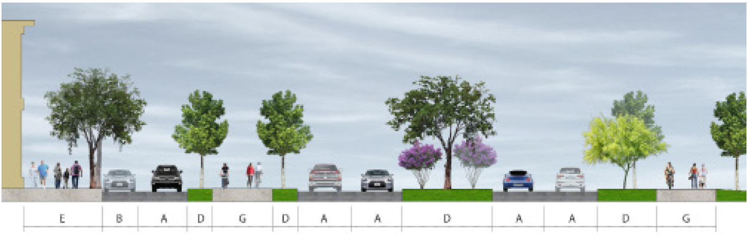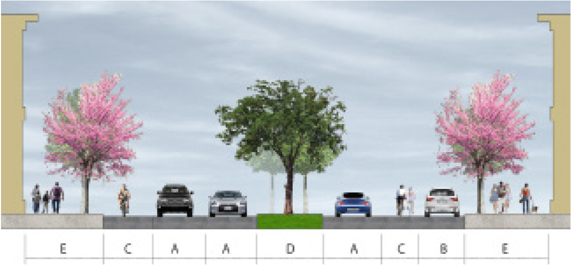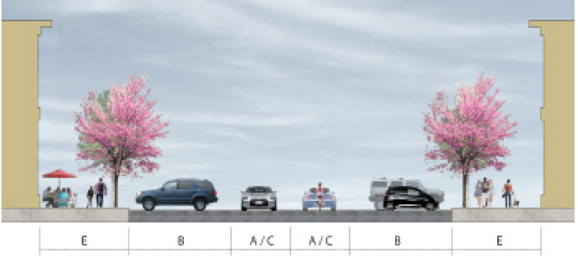 | E | Sidewalk | 6'—10' (main lane); 16'—20' with tree wells |