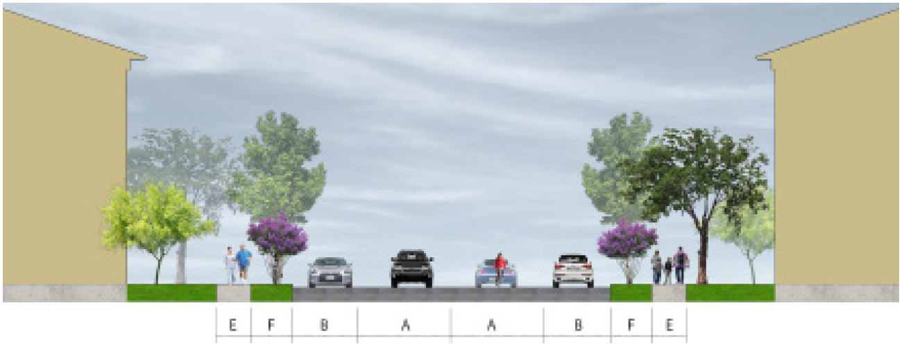 | E | Sidewalk | 16' (min.); 20' (preferred); 4' tree wells |