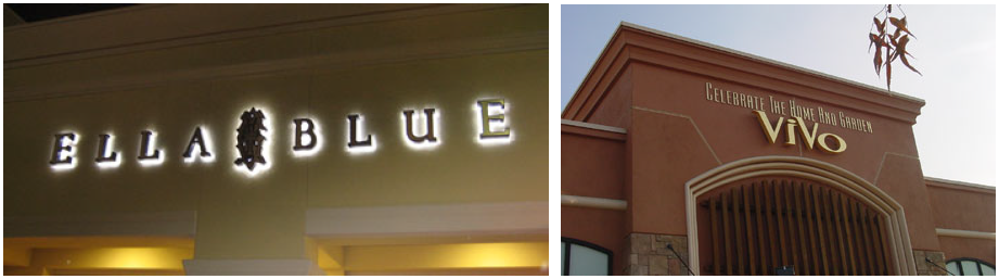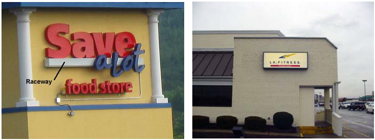 Wall signs. Wall signs shall be mounted flat against a wall of the building and installed in locations that do not detract from the design and appearance of the building. Internally illuminated or back-lighted signage shall be permitted only through the use of individual letters or characters mounted directly against the building. "Raceway" signs, in which letters or characters are mounted on a channel box containing wiring, transformers and/or other electrical components, shall be prohibited. (See examples, below.) External lighting for signs shall only be permitted through the use of gooseneck or other decorative lighting fixtures. (See examples, below.)