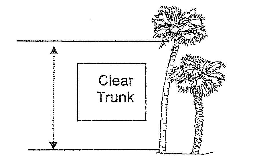 Clear trunk means a measurement from the soil line to the point in the canopy where the trunk caliper begins to taper abruptly. On many palms, this point will lie at the base of the petiole of the third or fourth youngest but fully expanded leaf.