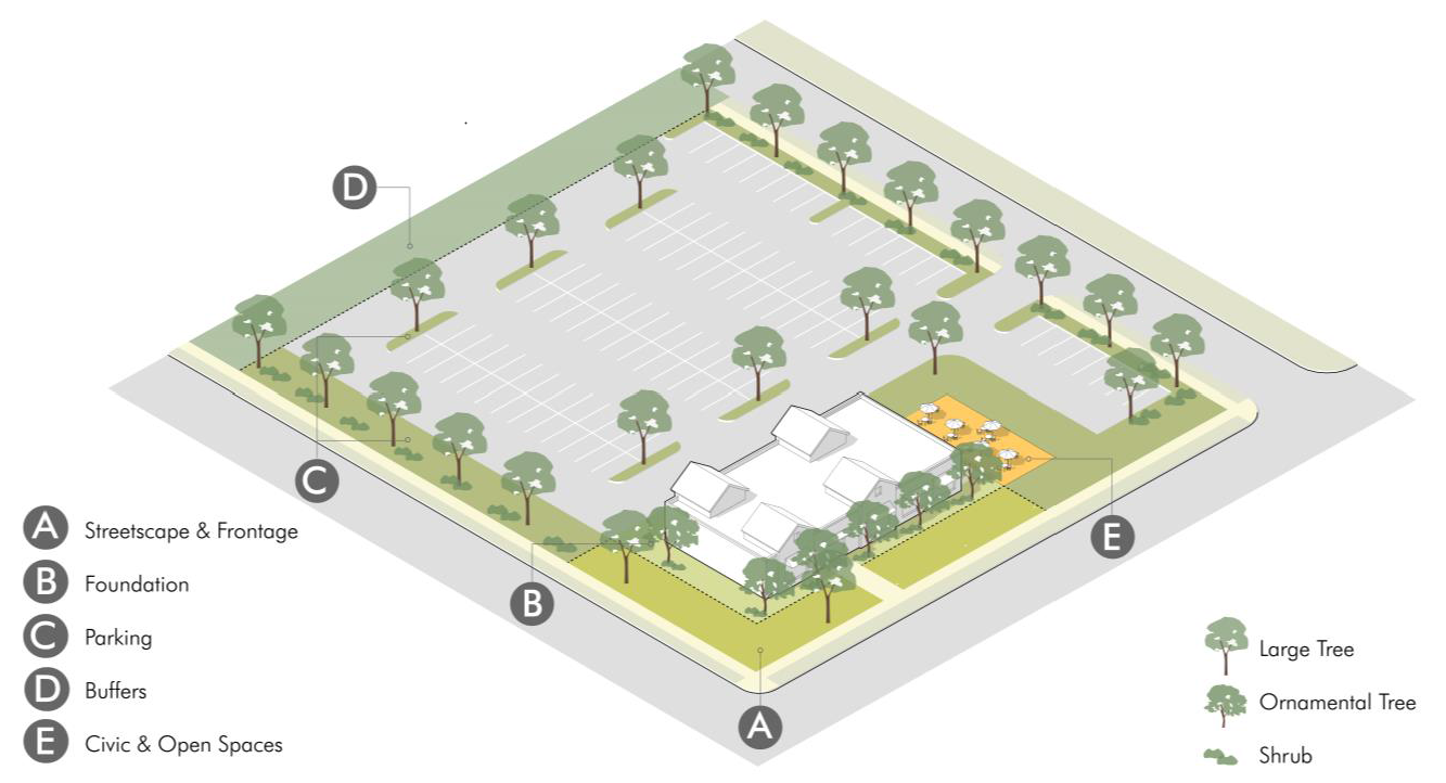 Foundation Trees & Shrubs. Foundation plantings shall be located in open spaces abutting the building or in planting beds associated with the design of any hardscape along the building frontage.