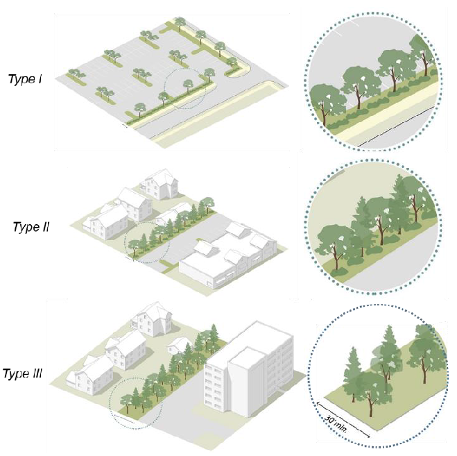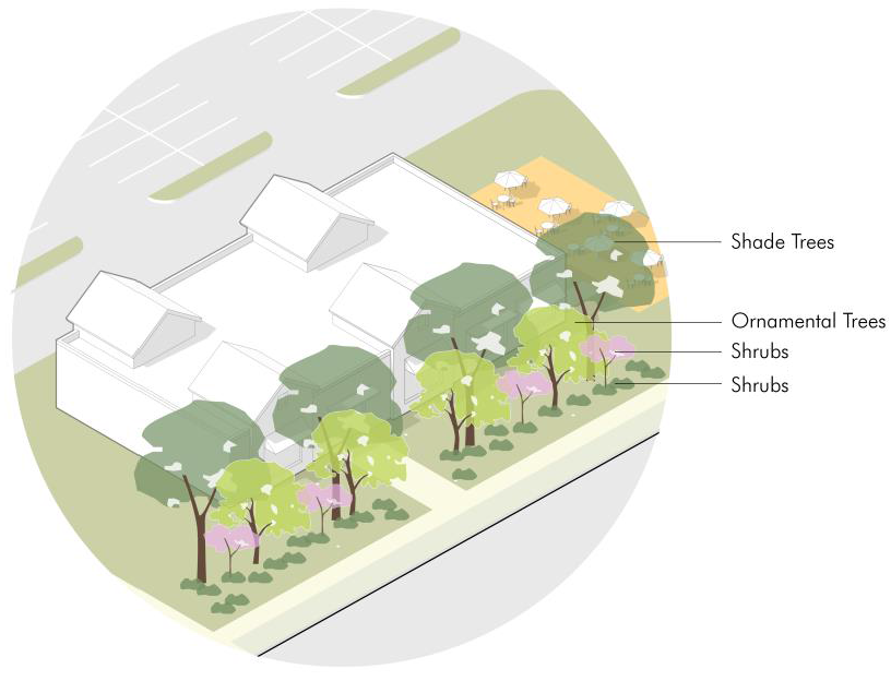Address three layers of scale, including large (shade) trees (high - 30'+), evergreen or ornamental trees (mid - 6' to 30'), shrubs, annuals and perennials, and ground cover (low - under 6') in a way that most directly mitigates the potential impacts and adjacencies.