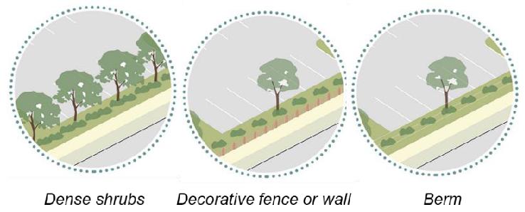Areas of parking or circulation near streets or property lines require physical barriers or landscape transitions to soften impacts of surface parking areas and provide low-level headlight screening.