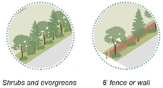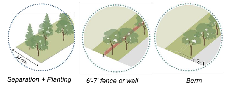 Utilize berms, vertical landscape elements, dense plantings, or other grade or spatial changes to alter views, subdue sound, and change the sense of proximity high-intensity elements of a site or building in relation to adjacent property and public rights-of-way.
