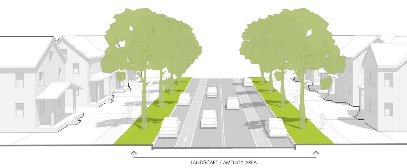 Streetscape elements, including curb, gutter, sidewalks, landscape and amenity areas, street lights, and street signs.