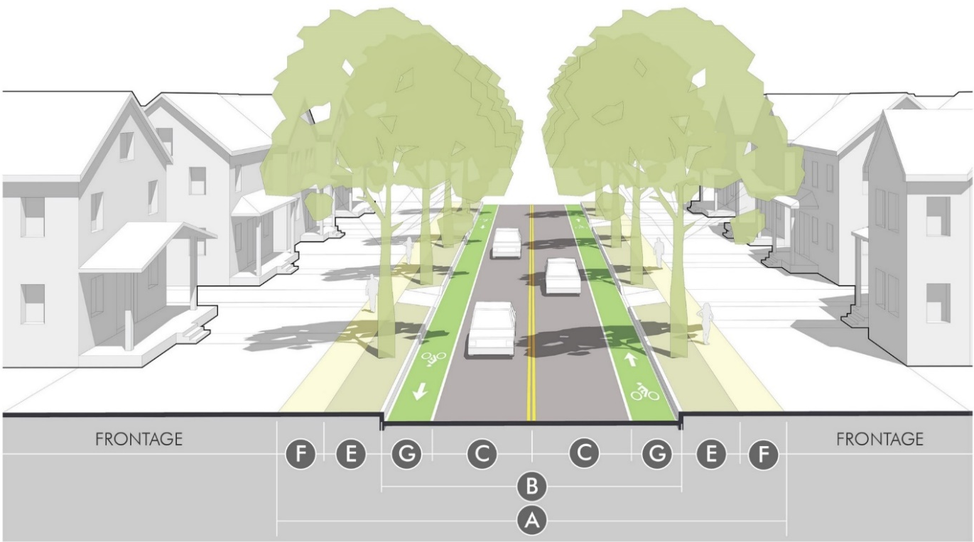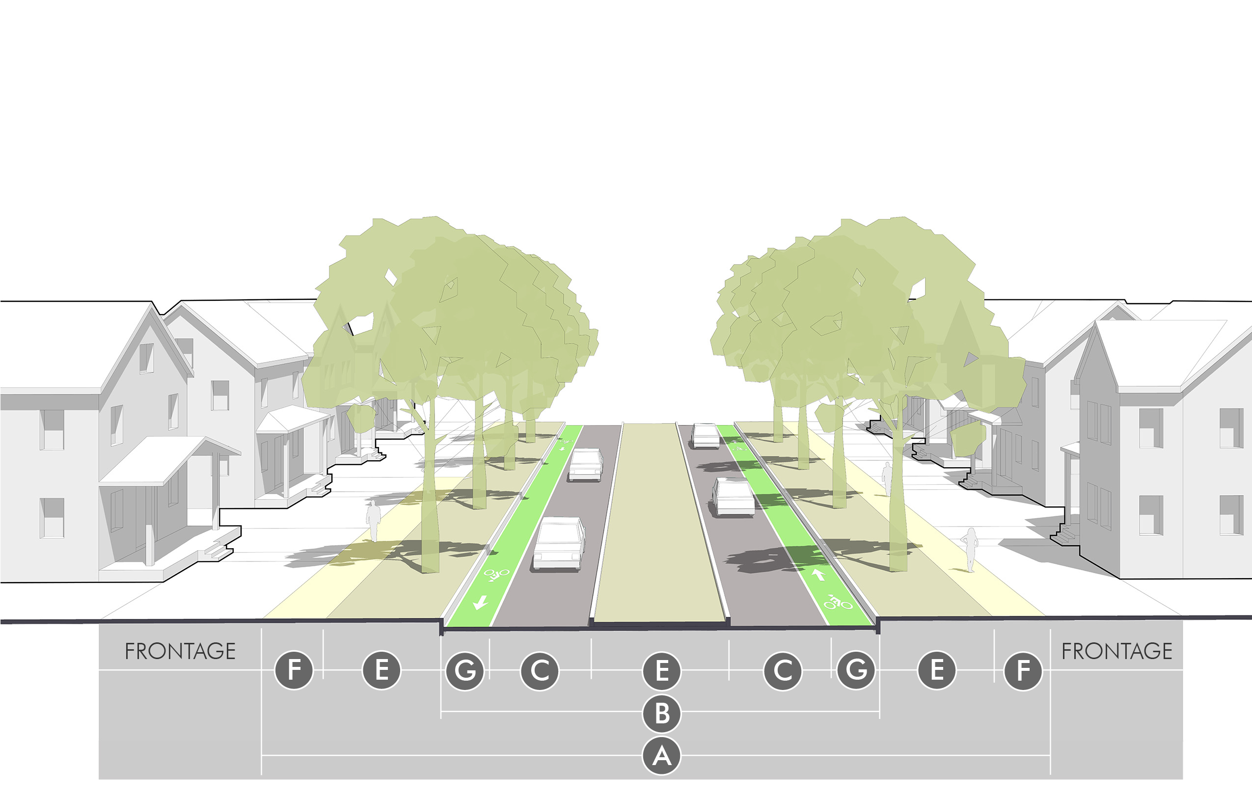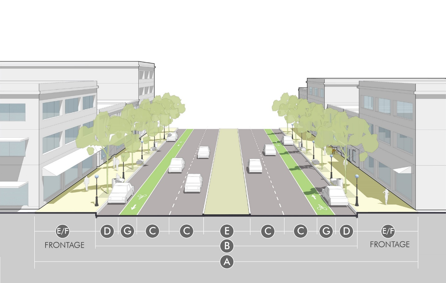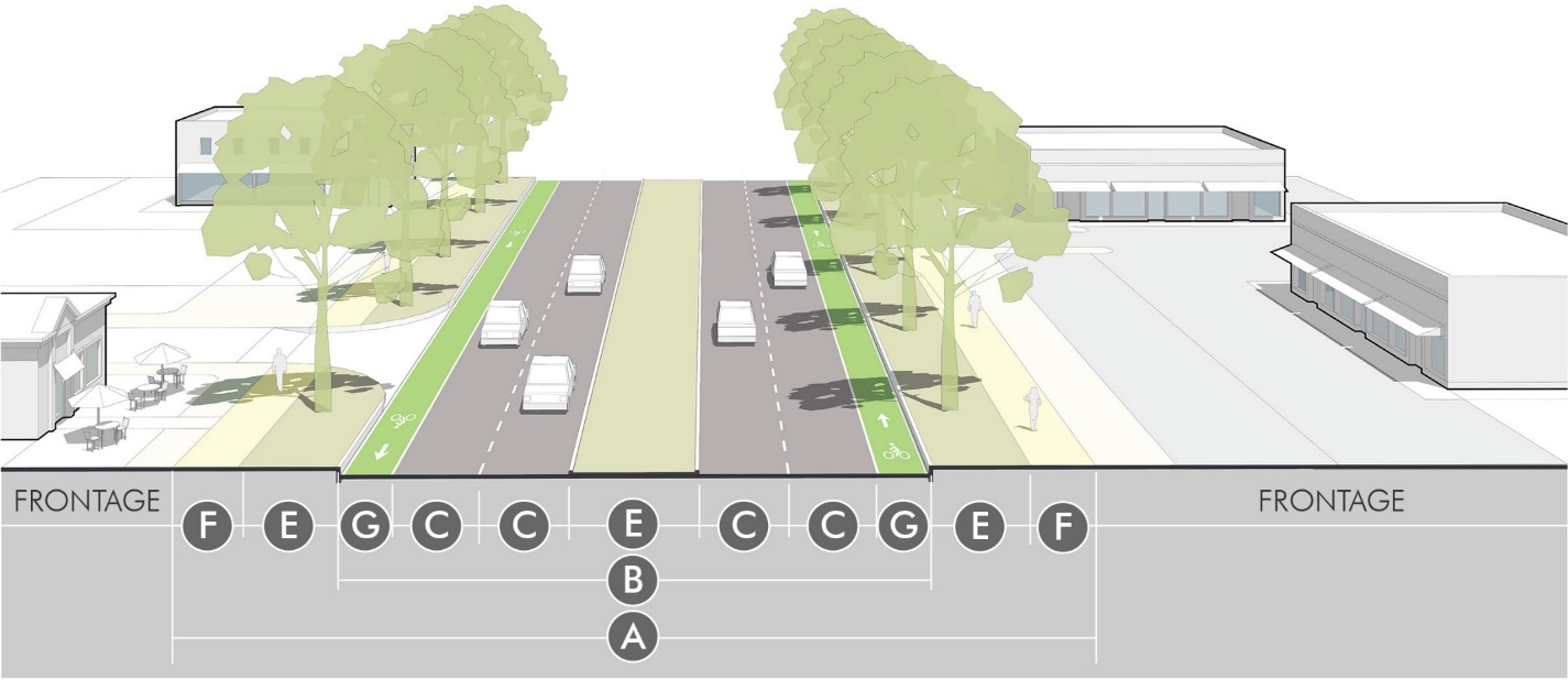 The Active Transportation Streets Design Guide includes criteria and rules of thumb to be used to modify any of the typical cross-sections for a particular context or block. It balances the priorities for the following street elements that encompass a complete street design.