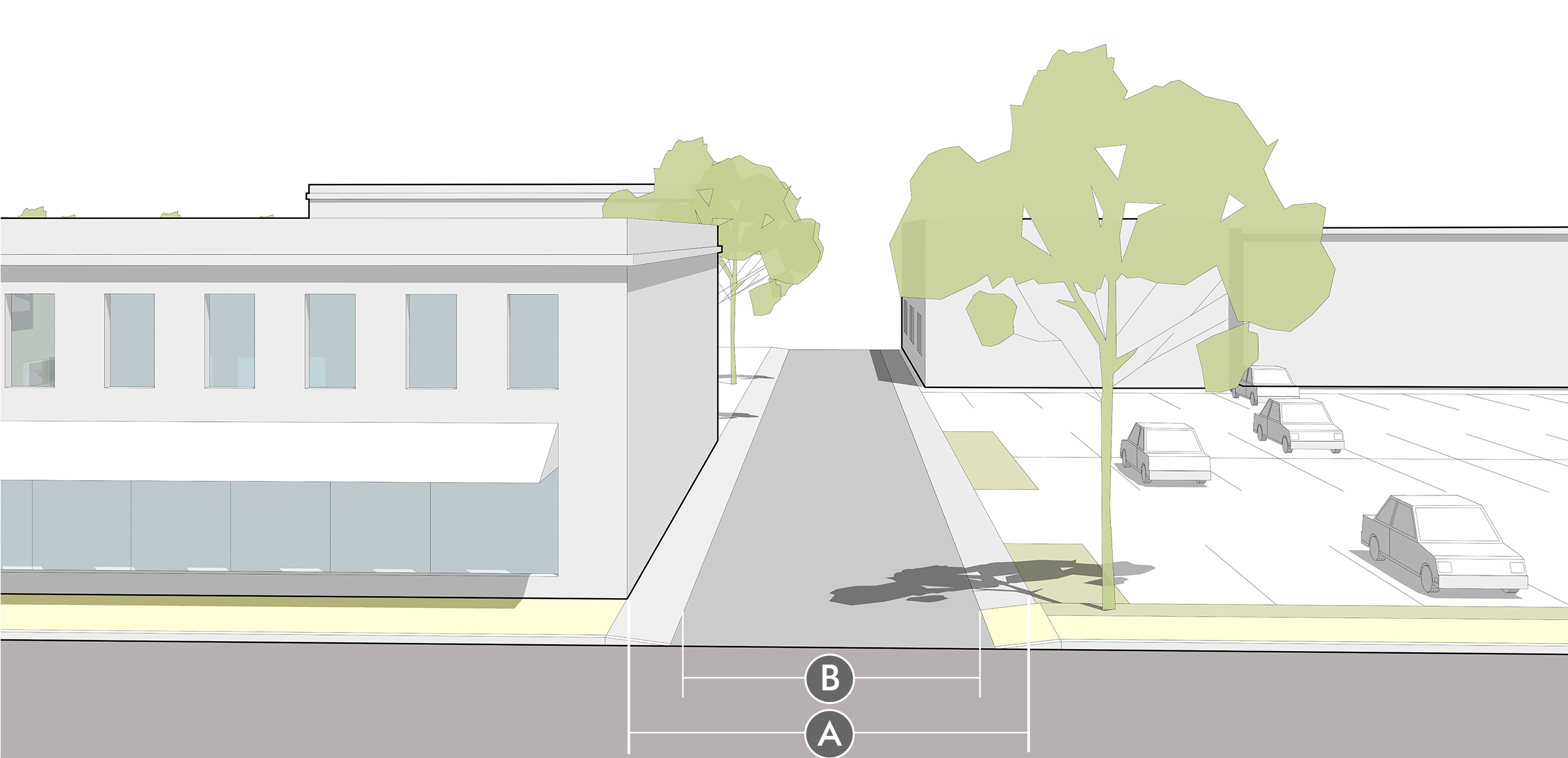 Turn Lanes. Turn lanes for left or right turn movements may be required for specific intersections at the discretion of the Director or based on an approved traffic study. Requirements for turn lanes should be based on careful consideration of the context balancing the impact of crossing distances for pedestrians, vehicle turning speeds, and prioritization of other planning, urban design, and traffic engineering issues. In general, this space should come from reconfiguration of the space within the roadway width near the intersection (i.e. within median space, narrowing lanes, or limiting on-street parking) rather than claiming space from the pedestrian area or streetscape, or rather than widening the road and right-of-way.